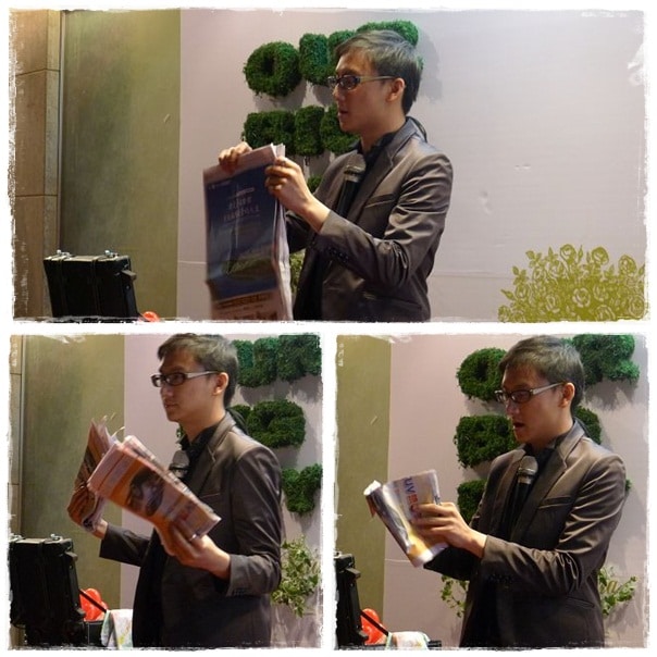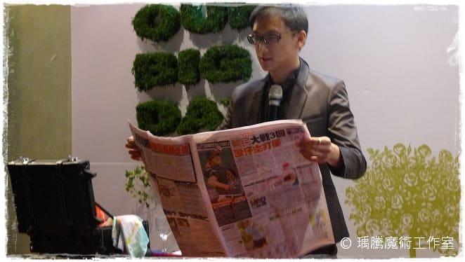 一開始的開場魔術表演,先拿出一份報紙,把它對折、撕開、對折、撕開….