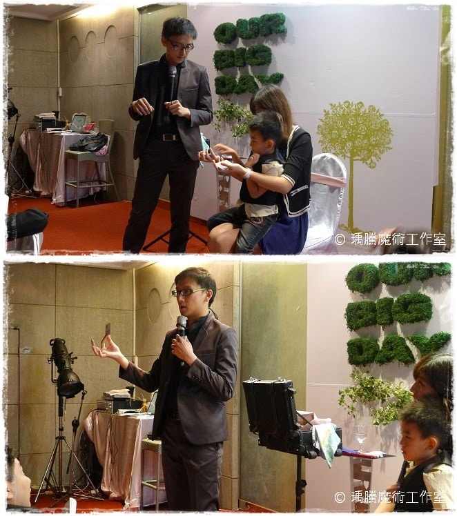 這次的婚禮魔術表演很特別,因為新人希望能讓他的小孩除了婚禮之外,也有生日party的感覺,魔術表演反而是希望能以小朋友為主。除此之外,還有一個很特別的地方是,新娘是一個網頁設計師,她說google找了很久魔術師的網站,當他看到我的網站就有一種安心的感覺,於是就沒多想和我聯絡了~聽到這句話,深深覺得當初我對於網站的用心有被看到阿 (淚奔),當然新娘的決定也是相當正確的,因為魔術表演好適合這種日子阿 ~