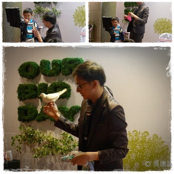 當第一位小朋友下台後,其他小朋友整個呈現有點暴動的狀態….為了安撫其他小朋友,所以再找一位小帥哥當我今天婚禮魔術表演的助手,只是…這次我口味重一點,還變出了魔術師最好的朋友 – 鴿子!
