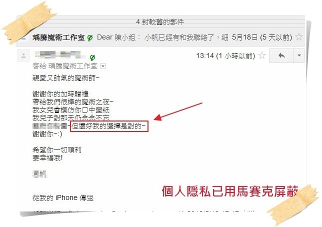 美麗的新娘子在表演結束後,還有寫信給我優,她說覺得自己的決定很正確,然後還說我是帥氣的魔術師啦 >///<