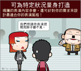 和其他魔術師的魔術教學不同的是,我非常了解一般人或是大老闆在學魔術時的需求,以及他們魔術表演的重點是什麼,,再加上我心理學的背景,所以可以用深入簡出的方式教學,讓一般人不用花費太多時間就能夠進行一場簡單的魔術表演,這也是為什麼我受到這位合夥人的信任再度受到委託