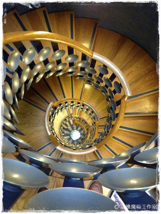整棟 The Magic Circle 的建築可以說是由這個知名的螺旋樓梯由一到三樓串連起來,許多魔術師或訪客來到這邊,都會與這個知名的地標合照 (不小心我的鞋子也入鏡了 XD)