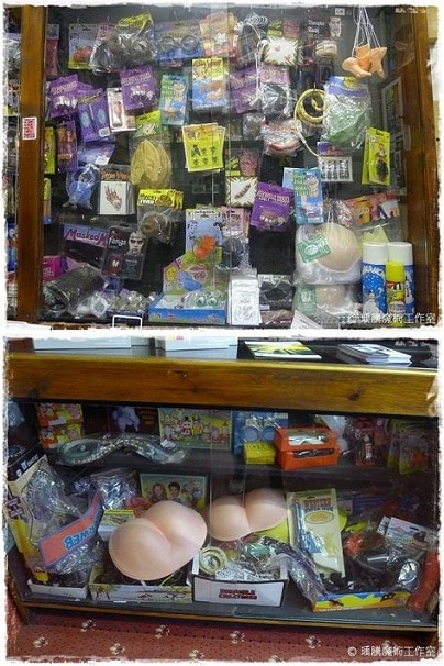 前面有提到,他有賣很多整人玩具 XD ,這張照片可以看到滿滿的整人玩具,連假屁股都有阿 XDD
