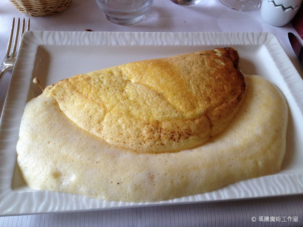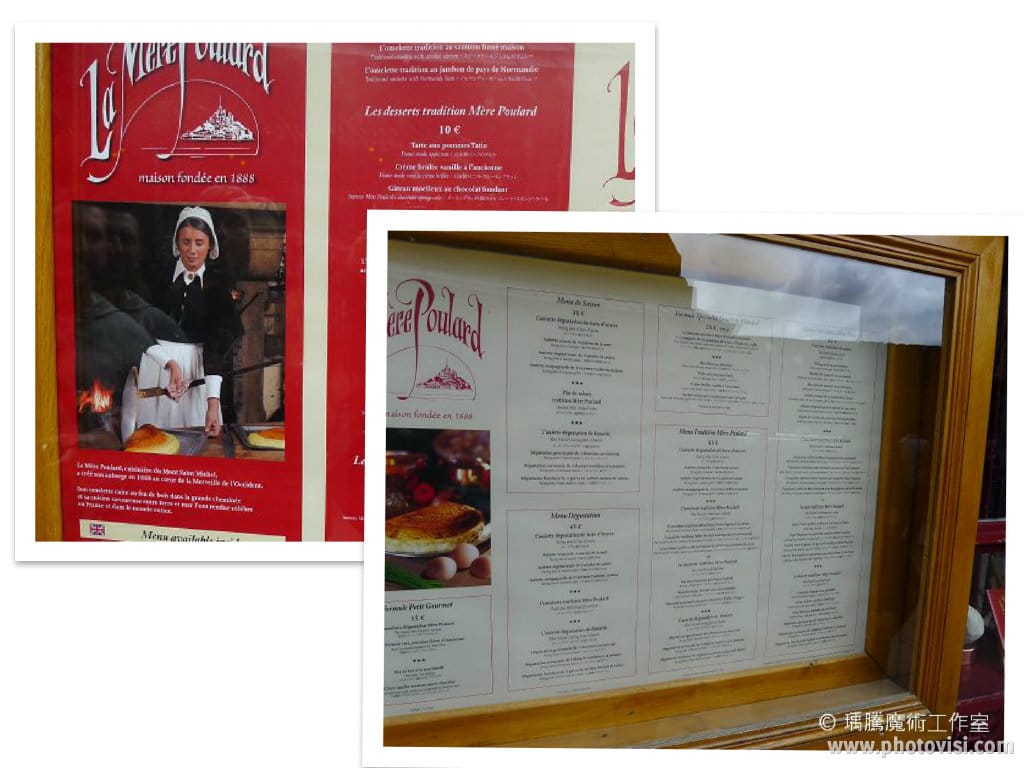 聖米歇爾山除了他知名的修道院外,另外一個頂頂大名的就是他們的蛋捲啦!整個聖米歇爾山到處都是有賣蛋捲的餐廳,但是最有名的莫過於「布萊媽媽」La Mère Poulard 的蛋捲了。之前在網路上搜尋一些資料的時候,大部分的文章都說他們人很多,要排隊很久…囧,但身為一個魔術師要排隊就太遜了,所以我一到那邊就馬上有位子了 XDD