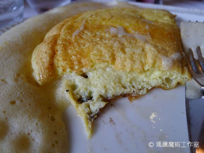 現在謎底揭曉,讓我把這個巨型蛋捲切開來瞧瞧,雖然蛋捲很大,但裡面其實不是很扎實那種蛋捲,比較像是把蛋白打成泡那樣,然後內餡有蘑菇,跟一般在台灣吃到的蛋捲很不一樣,但也還不錯吃。
