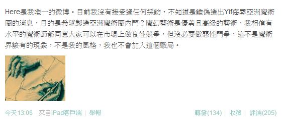 然後是YIF在他個人微博上的回應: