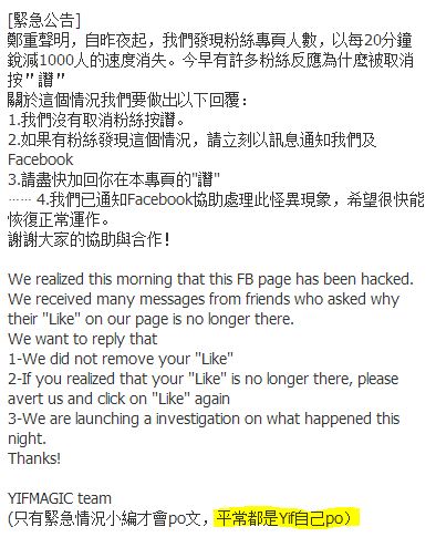 以下是最新YIF粉絲團的公告,如果依照內容所言,那YIF的中文應該是很不錯的,應該不是他自己所描述聽不太懂中文
