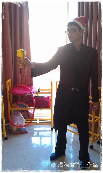 這場魔術表演對我來說,有一點點小挑戰….因為我必須要戴聖誕老公公的帽子 XD ,這讓我困擾很久阿,因為我戴帽子很不好看阿 囧…但…為了應景,我還是戴上去了 (而且還童心未泯的在玩小玩具 )