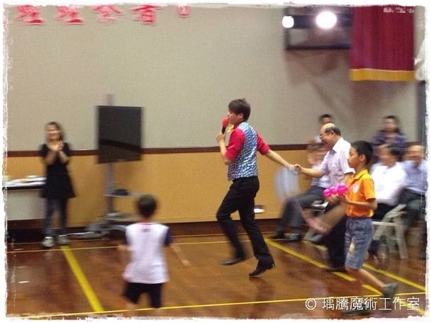 當然也不只和小朋友互動,和大朋友也是有精采的互動魔術,看這位同仁和我們魔術師踩著多麼輕快的步伐上台阿 XDDD
