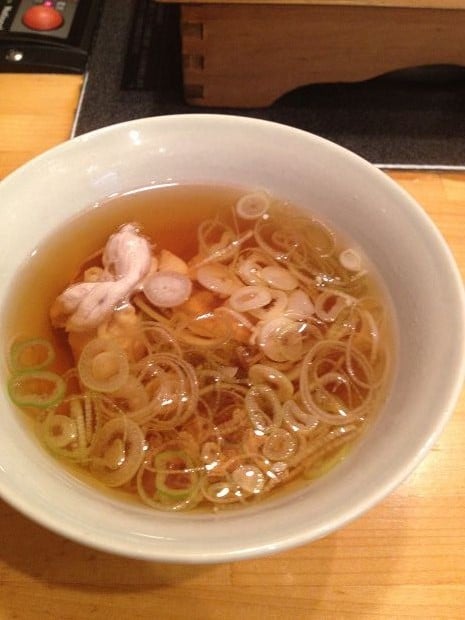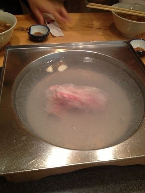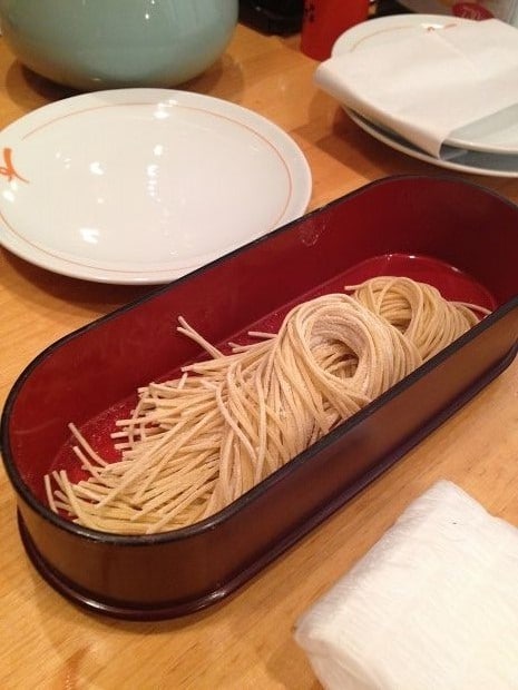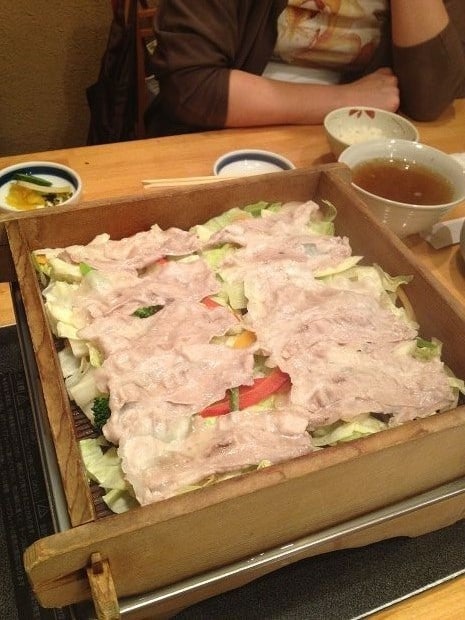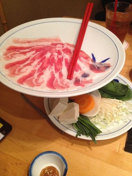 除了豬肉和蔬菜外,也有附上蕎麥麵。蕎麥麵是在蔬菜和豬肉之後最後下鍋~