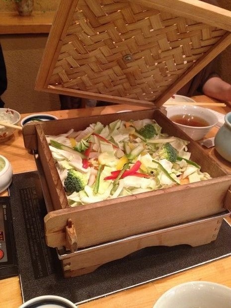 打開蒸籠,裡面有先放好蔬菜等配料
