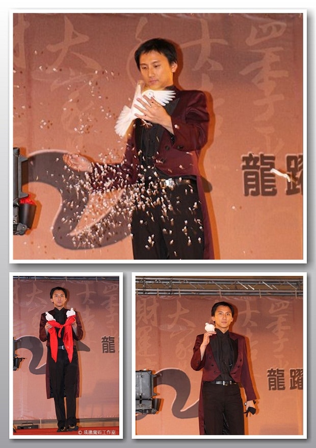 有一個比較特別的地方是,台灣絕大多數的魔術師在表演鴿子魔術的時候,都是像 Channing Pollock 一樣,搭配音樂在舞台上表演,就像瑀騰上面那張照片一樣,但這幾年瑀騰把鴿子魔術和互動魔術結合,在和觀眾互動的過程中,神奇的把鴿子變出來,讓觀眾更近距離體驗到鴿子魔術的驚奇。把舞台上優雅的鴿子魔術,變成爆笑又神奇的互動魔術,可以說是瑀騰的獨家絕活,台灣只此一家,絕無分號。