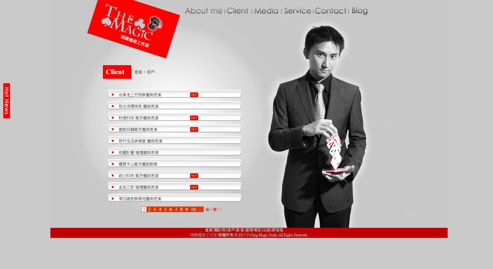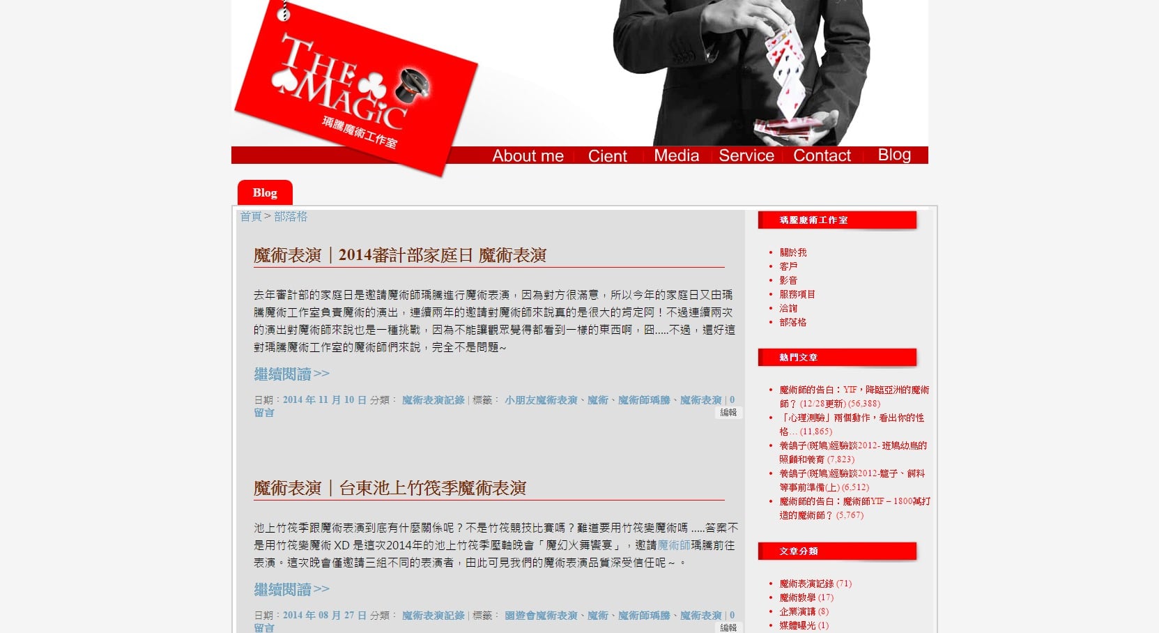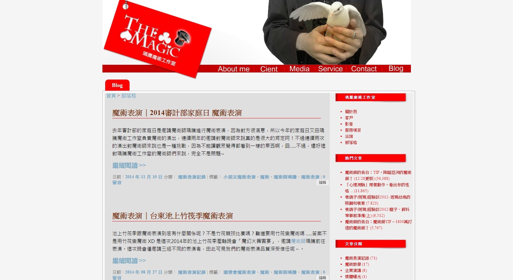 可以看到舊版官網色調是走紅灰路線,而會選用這個顏色,是因為多數魔術師都是採用黑色為主要色調。雖然說一般人對於魔術師可能第一印象就是黑色的燕尾服,但是我想走出一個不一樣的感覺,所以一般魔術師網站中會大量出現的撲克牌、魔術棒、魔術帽的元素也很少出現,在首頁的地方甚至是我坐在一張椅子上看著在地上的鴿子,而不是多數魔術師手中開扇、拿著鴿子等動作。這個 1.0 版的網站當初上線時,也獲得許多好評,甚至有許多客戶只看到我的網站就邀請我表演 XD