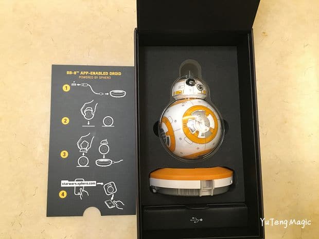 外盒打開後….BB-8 就靜靜的躺在那邊,裡面的說明書就只有旁邊那張卡片。除了 BB-8 之外,還有一個無線充電底座和 USB線。