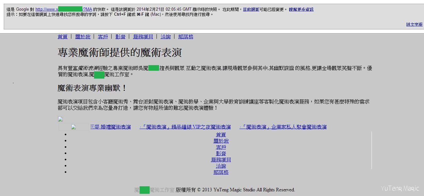 當時我試圖想理解為何發生這樣的事情,於是我利用Google 頁庫存檔的功能去查看那個連結。(Google頁庫存檔會將網站在過去某一個時間點的樣子記錄下來,所以代表著在那一個時間點網站是長那個樣子)一查看之後整個讓我大吃一驚,應該是假的吧?是我眼睛業障重嗎?我的網站居然被複製,然後有【瑀騰】的地方都被置換成【魔OO】,也就是 魔術師P 的公司名稱。
