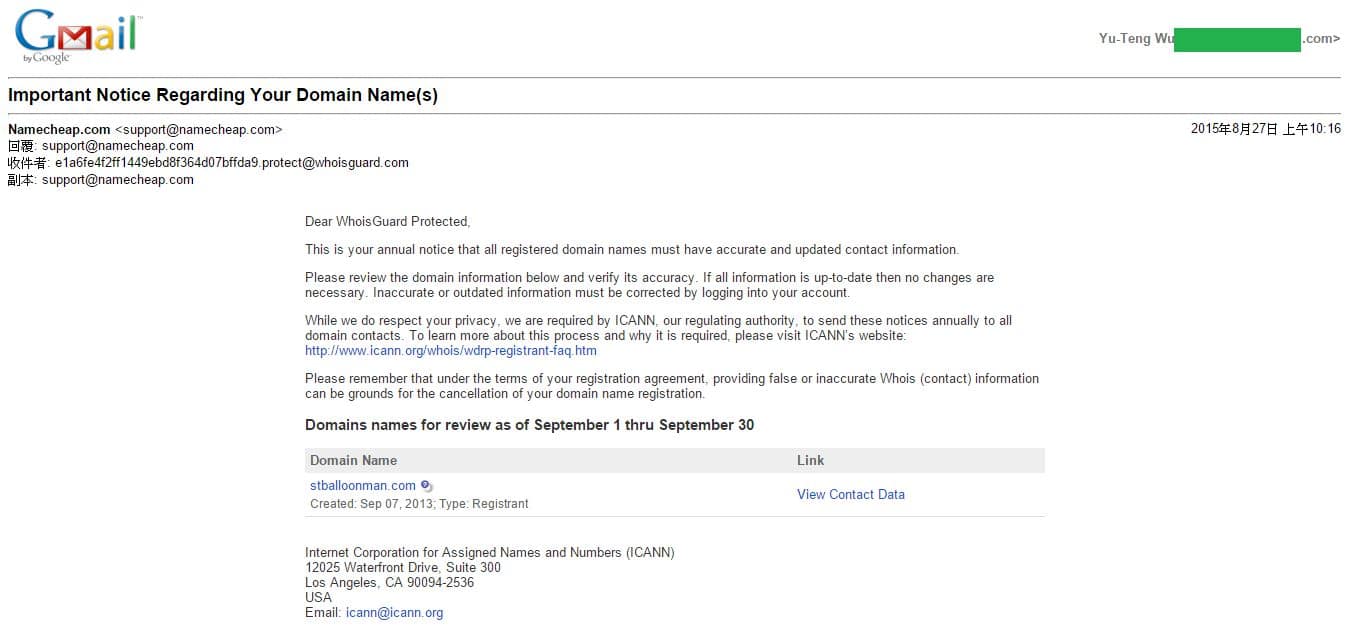 而在下方圖片中,也可以看到我申請的網址的確是有收到驗證信