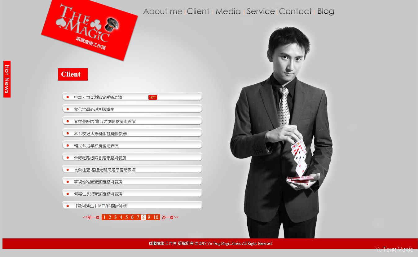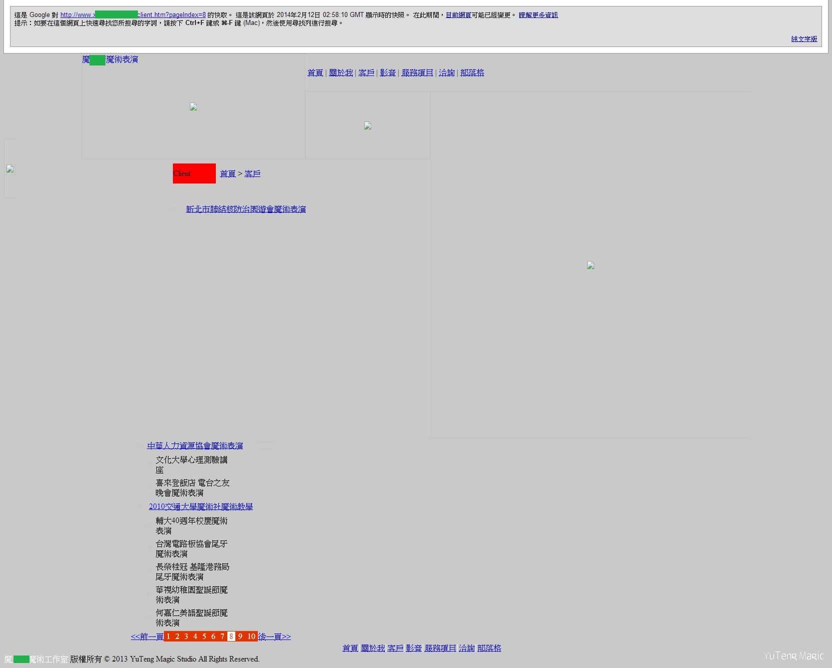 (補充說明一下為什麼這首頁和合作客戶頁都有破圖,或是長的怪怪的。一個原因是當初首頁是用萬惡 Flash製作,頁庫存檔只能記錄meta description,另外一個是頁庫存檔是一個紀錄性質的功能,所以有部分圖片會沒有紀錄。想知道網站的原始樣子,請點這個連結:魔術師瑀騰:全新官網重磅登場)