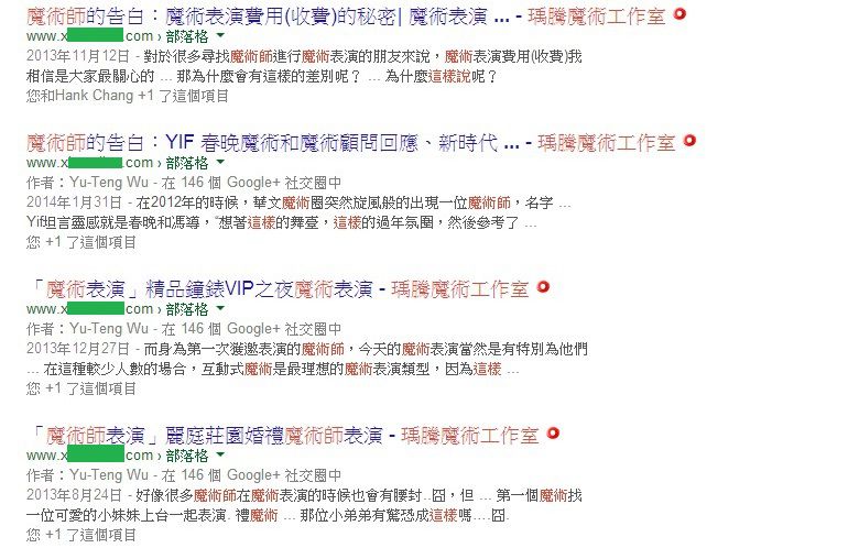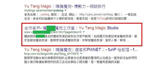 在2014年4月的時候,我用關鍵字【YuTeng Magic】進行搜尋時,在搜尋結果的第一頁發現一個奇怪的搜尋結果。搜尋結果的標題和下方的描述都跟我的網站一樣,但是我的名子【瑀騰】都被置換成另外一位魔術師P的公司名稱。下方圖片綠色處,就是被修改的地方。