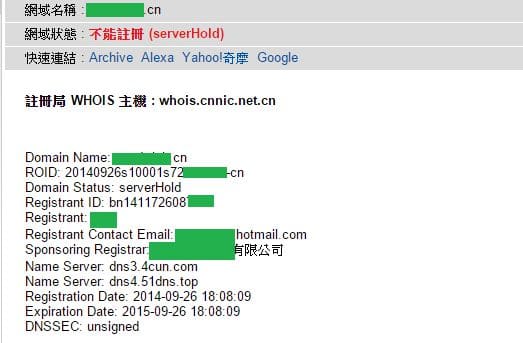 在先前的文章中提到,申請網域的時候需要電子郵件信箱進行驗證,另外透過 Whois 這個網站,可以查到該網域申請者的基本資料,例如註冊信箱、姓名、地址等等。最初我是有查詢網域A的申請信箱,但查到的是一個註冊在北京的大陸信箱 (以下簡稱信箱A,用hh@hhh.cn表示),由於是註冊在大陸,所以我也無法去做些什麼。但當天不知道為什麼,我忽然注意到信箱A後面的網域。
