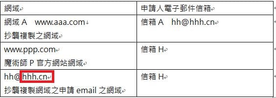 整個過程我想必須要花多一點時間理解,所以就使用表格來呈現。首先信箱H申請了魔術師P官方網站的網域和hhh.cn兩個網域,而hhh.cn這個網域,是申請網域A的信箱的網域。因為必須要先申請網域才能設定信箱,所以申請網域A的信箱 hh@hhh.cn,是由信箱H先申請hhh.cn這個網域再設定hh@hhh.cn 這個信箱,最後透過 hh@hhh.cm這個信箱去申請網域A。