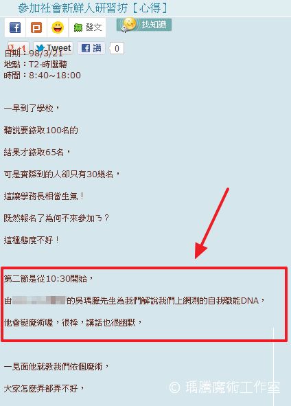 除了豐富的專業外,結合魔術更是讓整個演講增色許多,我去中正大學演講的時候,承辦人員還說我是第一個在電腦教室演講的人,同學全部專心聽講沒有玩臉書!(再次驕傲),下面付上一個同學聽演講的心得~